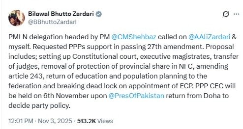 He announced that the PPP Central Executive Committee (CEC) will convene on November 6 to deliberate on the matter. The party’s official stance on the 27th Amendment will be determined after President Asif Ali Zardari returns from Doha.
