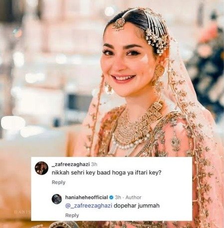 According to widespread social media chatter, there are claims suggesting Hania Aamir and Asim Azhar might tie the knot during Ramadan. One curious fan took the opportunity to ask whether the nikah ceremony would occur after sehri or iftar.