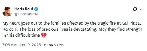 Web Desk: Fast bowler Haris Rauf of the national cricket team has voiced sharp criticism against the government following the tragic Gul Plaza incident, labeling it as a systemic failure in safeguarding human lives.