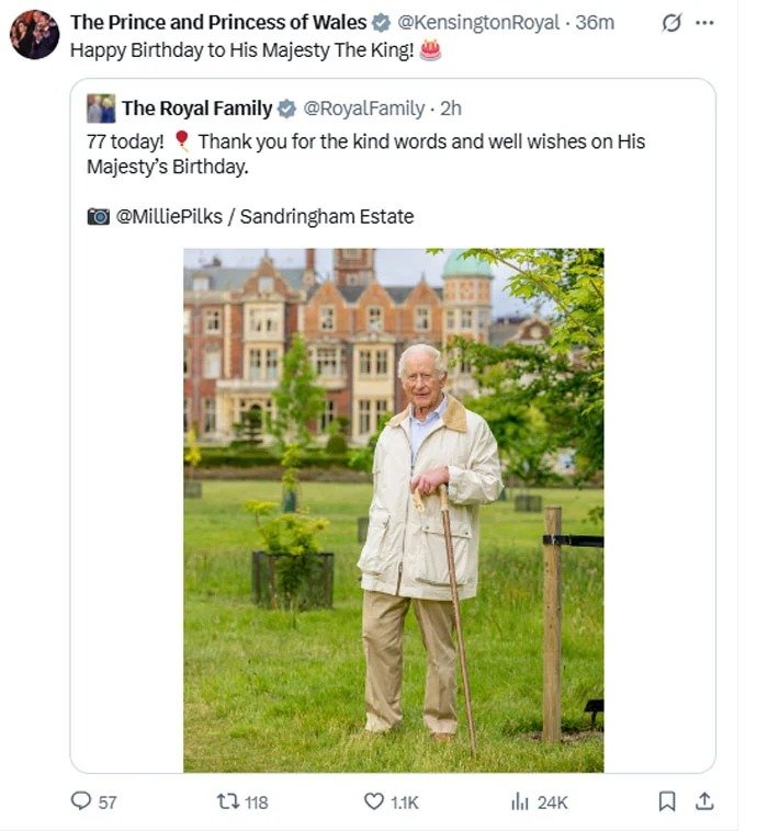 On behalf of the royal couple, Kensington Palace shared a warm message celebrating the occasion. Kate and William reposted a photograph of the King, originally shared by the Palace on X (formerly Twitter), with the message: Happy Birthday to His Majesty The King!