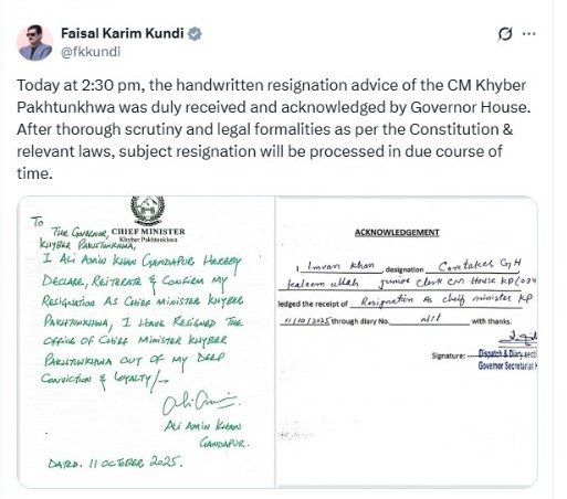 PESHAWAR: The Governor House has officially acknowledged receiving the resignation of Khyber Pakhtunkhwa Chief Minister Ali Amin Gandapur, as confirmed by Governor KP Faisal Karim Kundi.