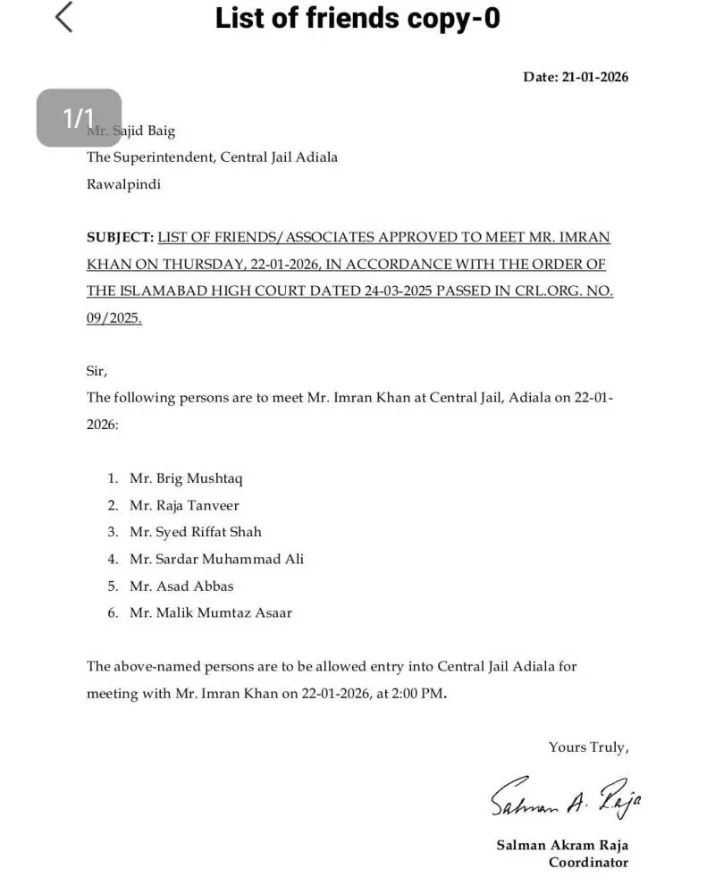 The PTI coordination team, led by Salman Akram Raja, forwarded the names of six visitors: Brig Mushtaq, Raja Tanveer, Syed Riffat Shah, Sardar Muhammad Ali, Asad Abbas, and Malik Mumtaz.
