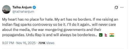 Amid the intensifying backlash, Talha Anjum took to X (formerly Twitter) to address the situation head-on. In a defiant post, he stood by his actions, stating, “My heart has no place for hate. My art has no borders. If me raising an Indian flag sparks controversy, so be it. I’ll do it again. I will never care about the media, warmongering governments, and their propaganda. Urdu rap is and will always be borderless.”