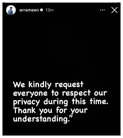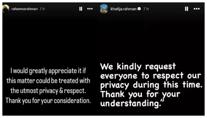 اے آر رحمان کے بیٹے اے آر امین نے اپنی اسٹوری میں لکھا ‘ہم سب سے گزارش کرتے ہیں کہ اس وقت ہماری پرائیویسی کا احترام کریں اور ہماری صورتحال سمجھنے کے لیے آپ سب کا شکریہ’۔