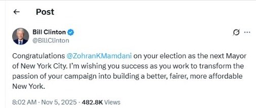 During this time, Mamdani received well-wishes from political figures such as former presidents Bill Clinton and Barack Obama.